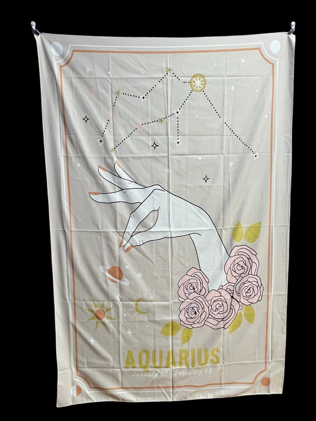 Zodiac Tapestry Embrace your celestial vibes with our Zodiac Tapestries. Featuring hands reaching out. Each tapestry features the name of one zodiac sign and respective dates. This wall hanging adds a touch of color to any space. Tap into the power of the stars and showcase your unique personality with this quirky piece. MATERIALS: polyester DIMENSIONS: APPROX: 59 inches  x 39 inches  PACKAGING: BOX CONTENT: ONE TAPESTRY WITH HANGING CLIPS COLORS: MULTI/ PASTEL Tapestries can vary in color and print.