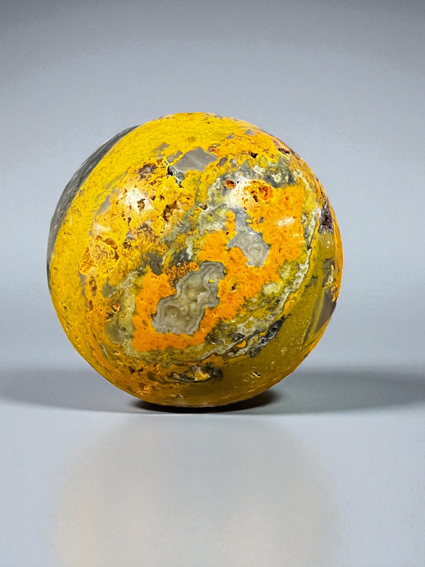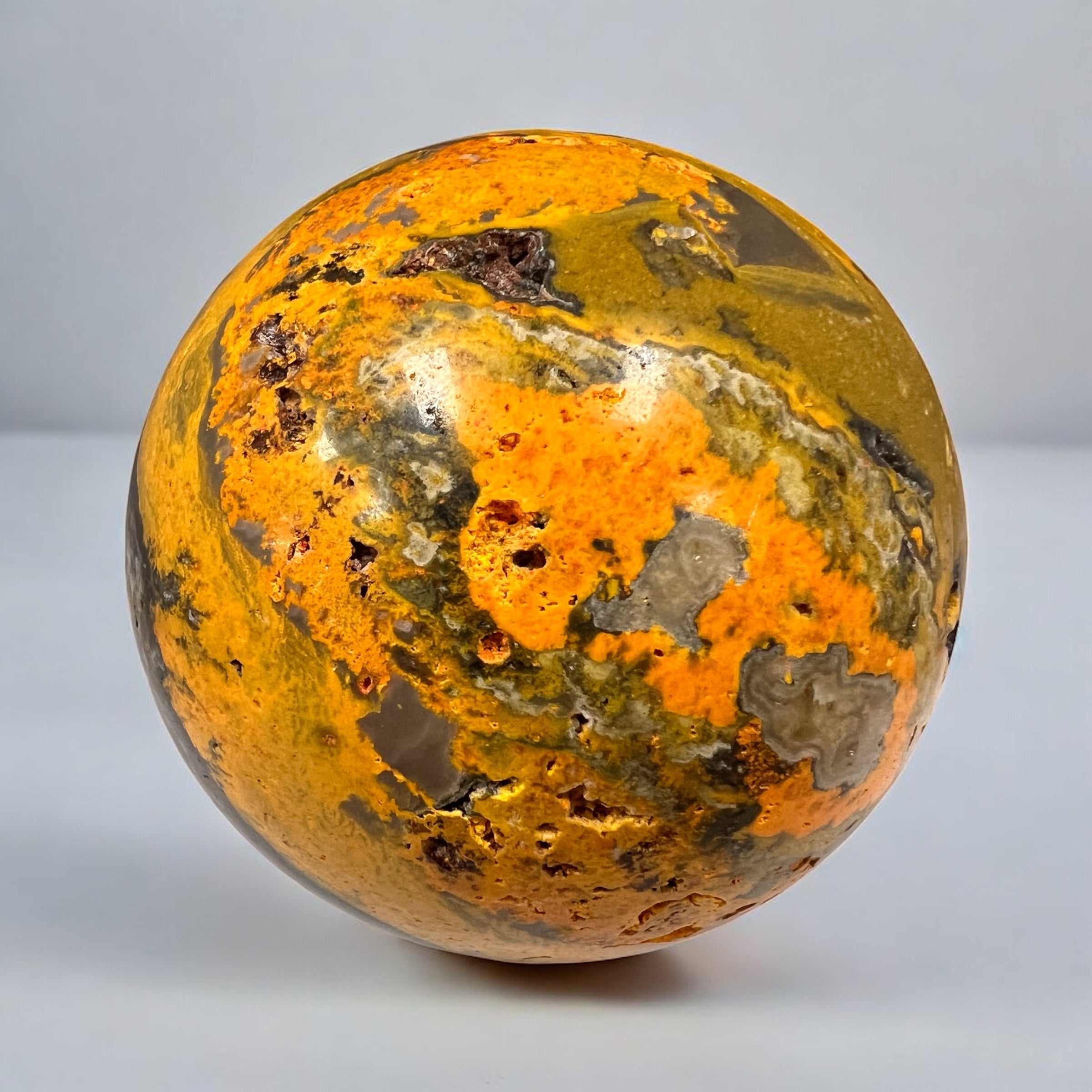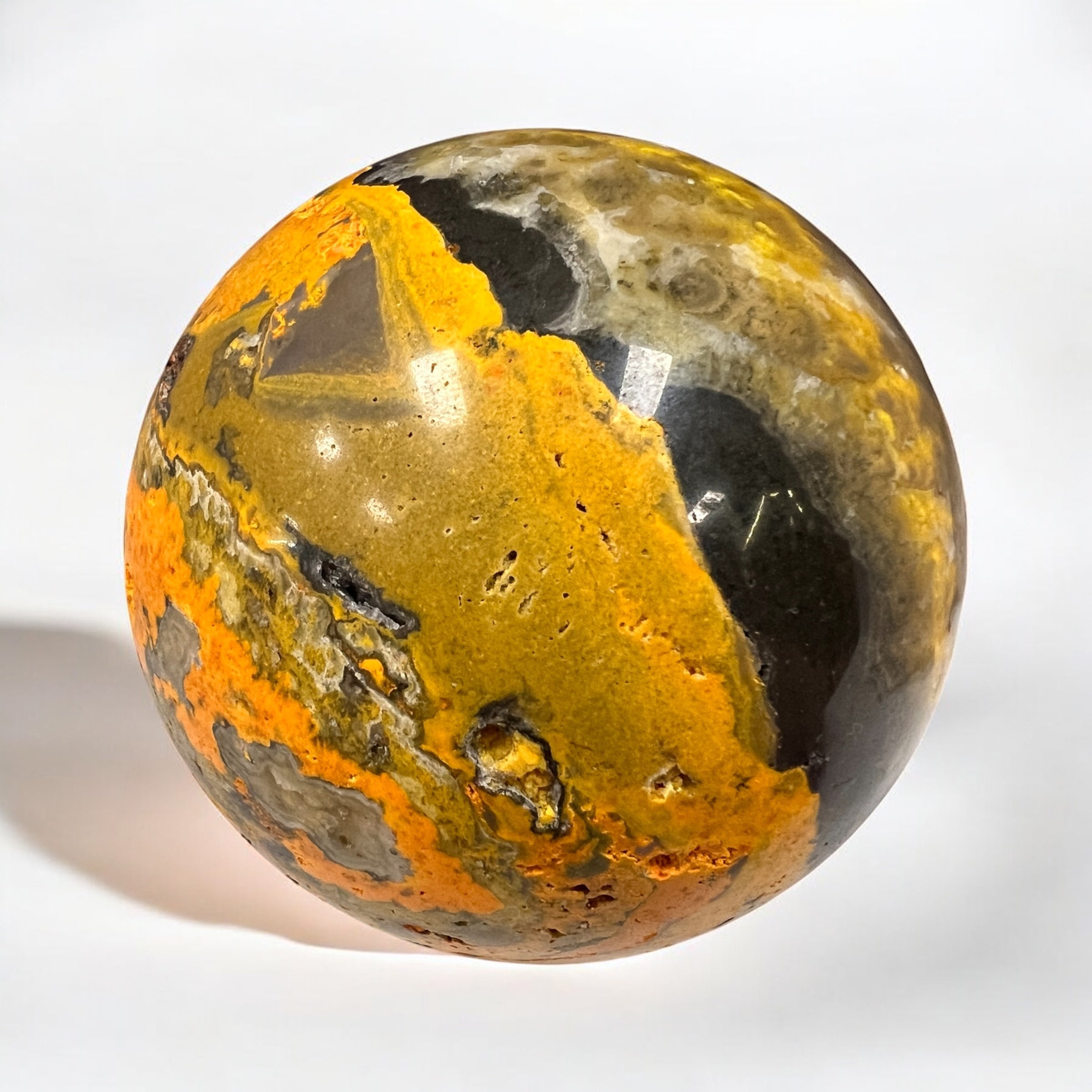 This stunning Bumblebee Jasper sphere, mined from the volcanic landscapes of Indonesia, measures 2.5 inches in diameter and weighs 376 grams. Known for its fiery yellow, orange, and black banding, Bumblebee Jasper is a stone of strength, vitality, and transformation.