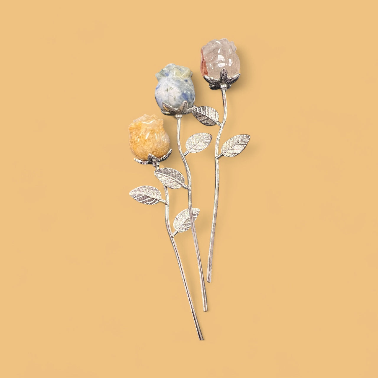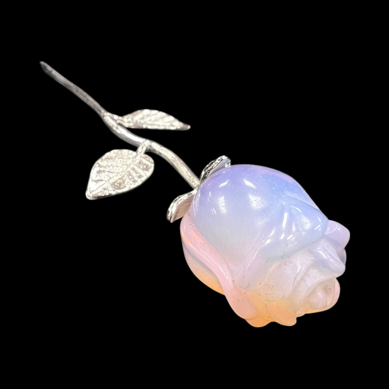 Celebrate beauty, healing, and intention with our Crystal Gemstone Roses — stunning hand-crafted gemstone blooms set on silver metal alloy stems with two detailed leaves. Each measures approximately 6 x 1 inch (2 inches wide including leaves) and weighs around 34 grams, making them the perfect decorative and metaphysical treasure for altars, desks, or sacred spaces.