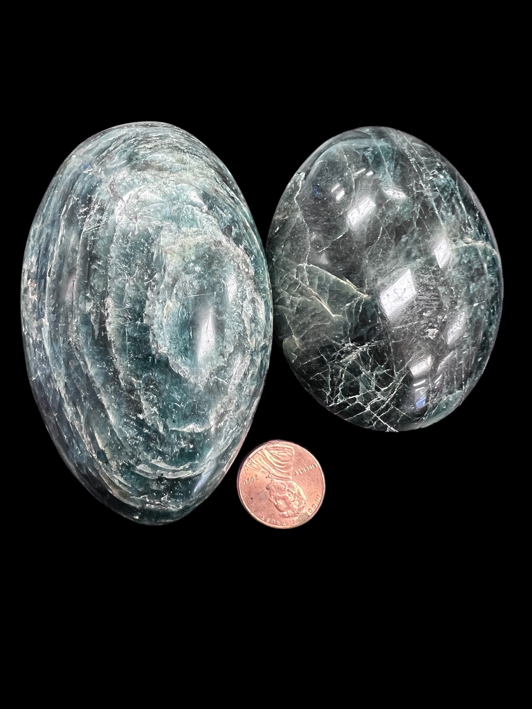 Our Apatite Palm Stones measure approximately 2.75 inches x 2 inches and weigh between 120–220 grams, giving them a substantial yet comfortable feel. Their deep green color reflects renewal, growth, and alignment with the heart chakra, making them a powerful tool for both emotional healing and creative expansion.