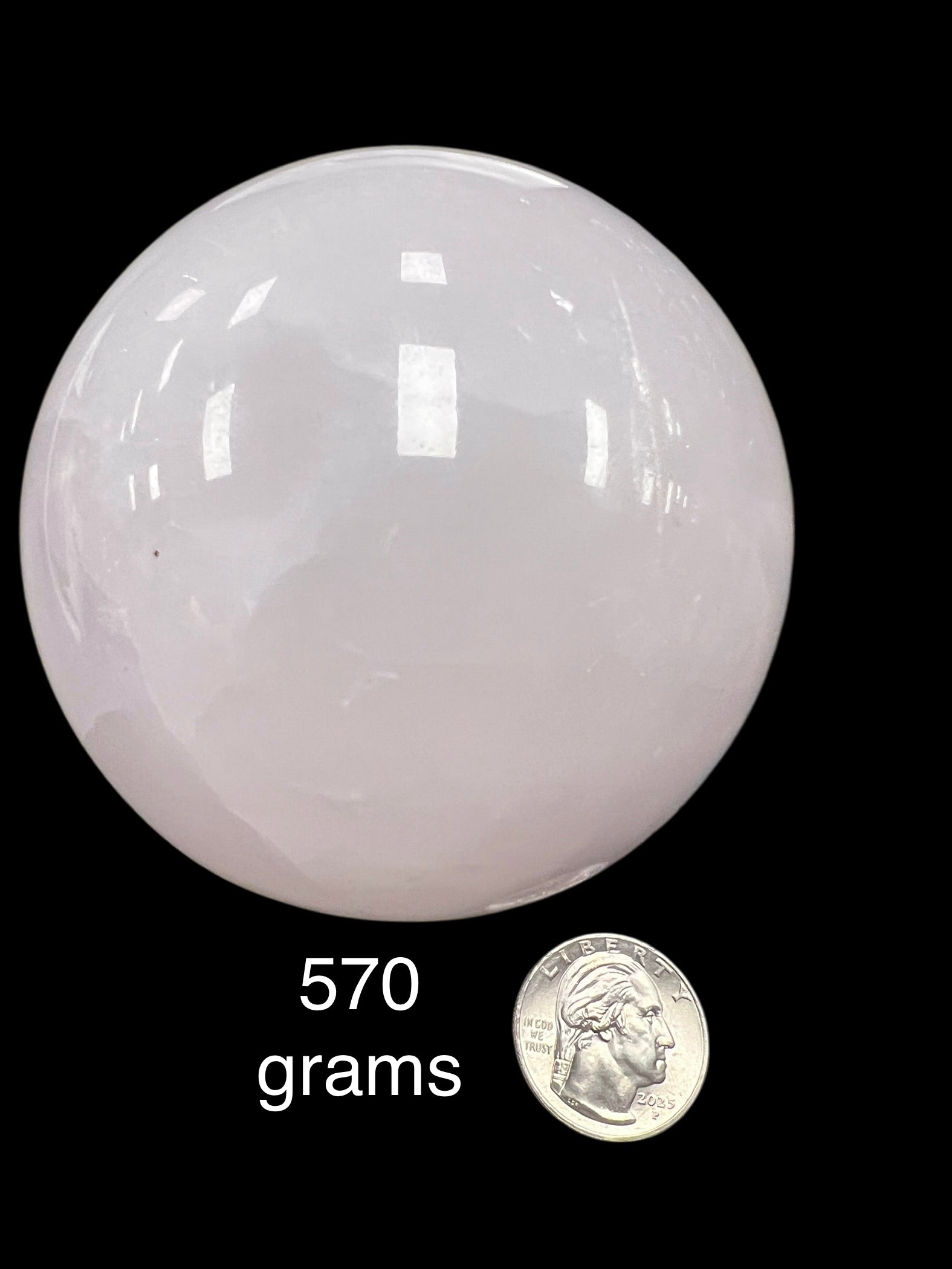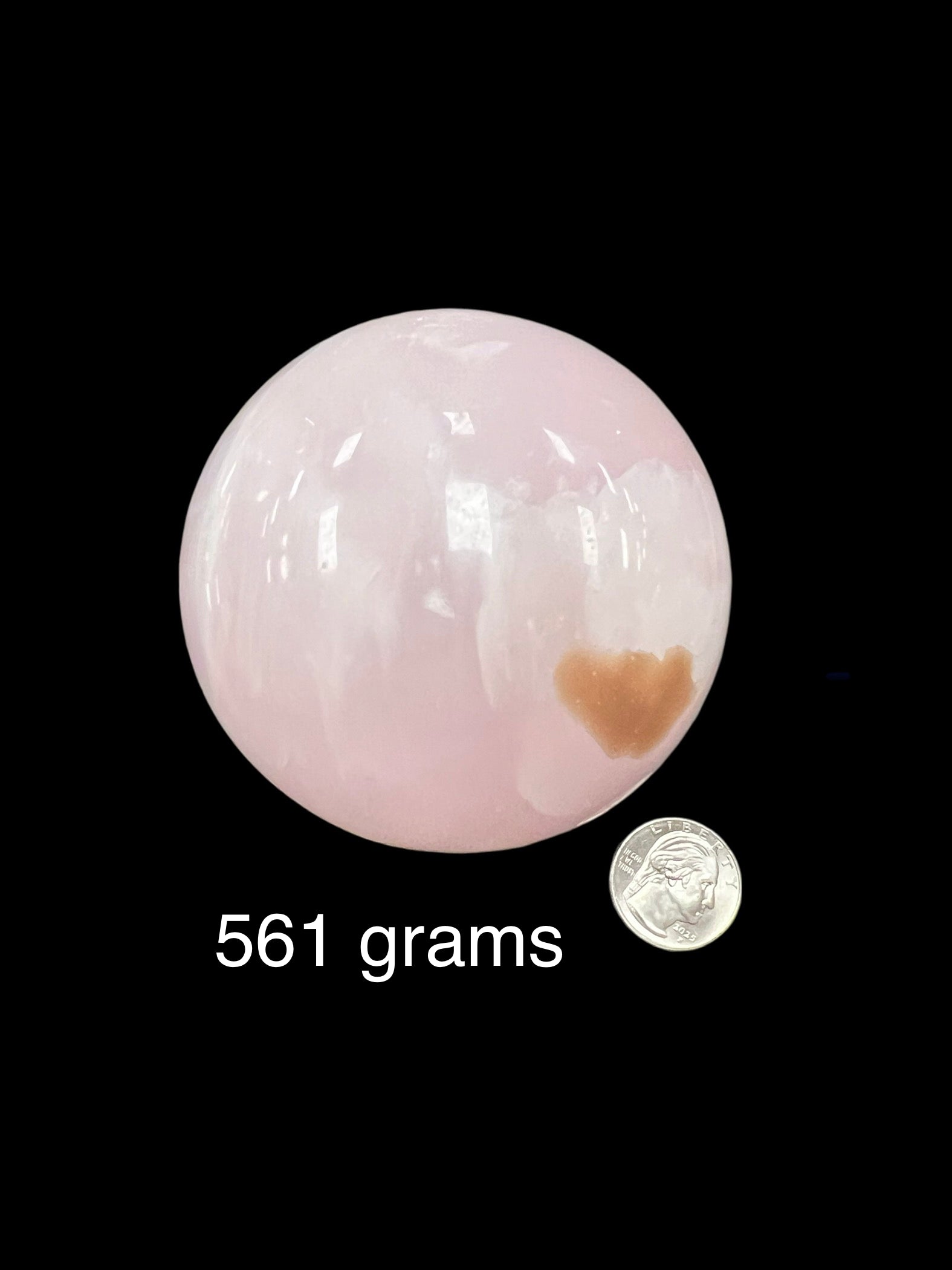 These stunning Mangano Calcite spheres glow under UV light and radiate the softest shades of blush and rose pink. Available in two substantial sizes — 561 grams (2.5 inches) and 570 grams (2.75 inches) — each sphere is beautifully polished to showcase the natural banding and delicate color variations that make Mangano Calcite so beloved.