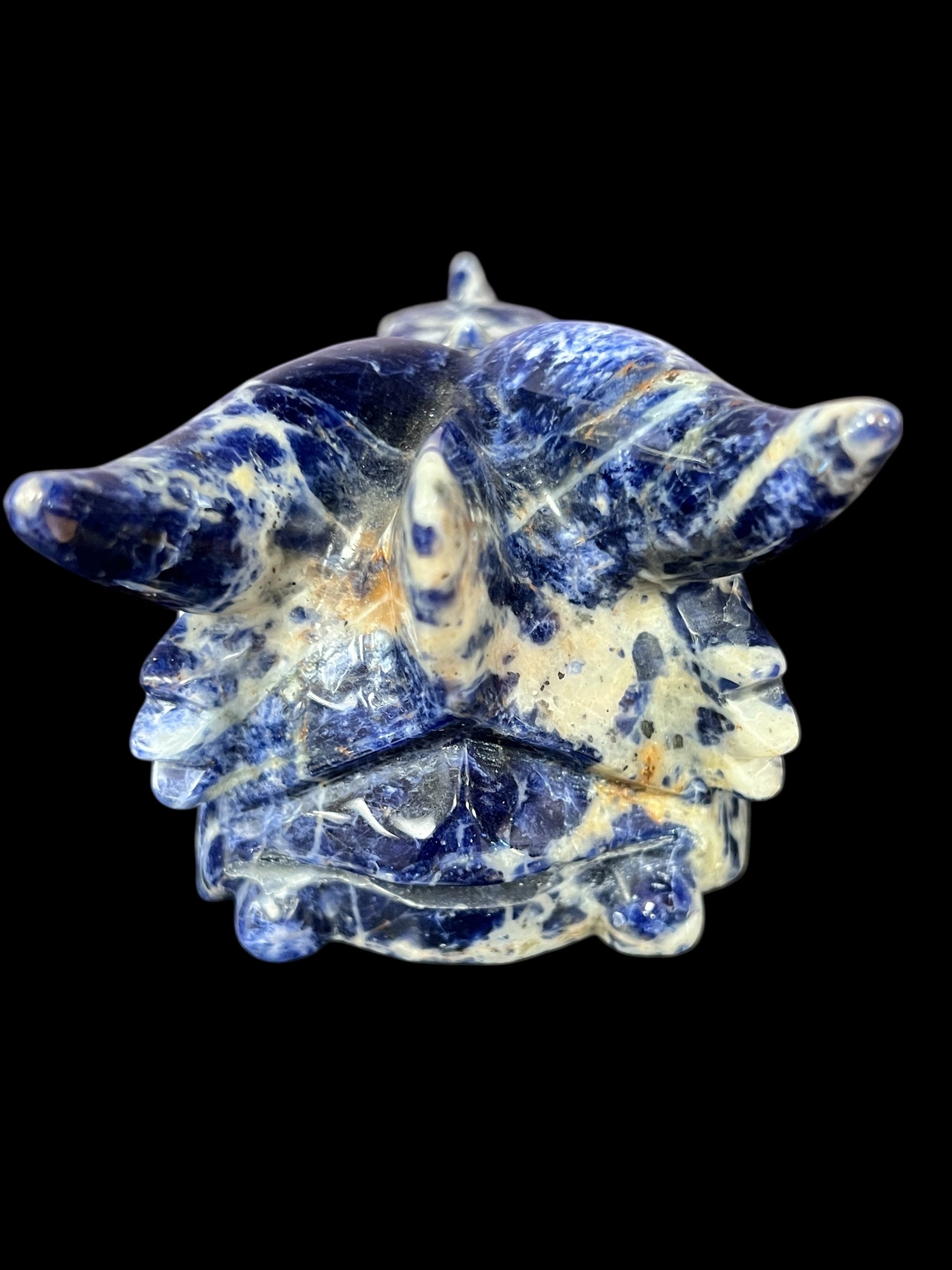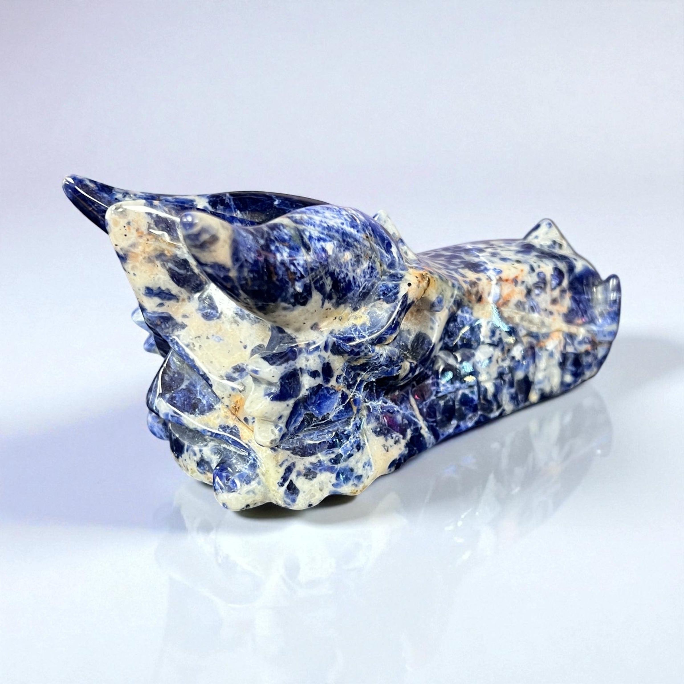 Unveil the fierce, mystical energy of this hand-carved Sodalite Dragon Skull, a powerful fusion of ancient dragon lore and the deep intellectual magic of Sodalite. Measuring 5.5 inches long, 2.5 inches wide, and 2.5 inches tall, and weighing 601 grams, this substantial piece is crafted to command presence on any altar, display shelf, or meditation space.
