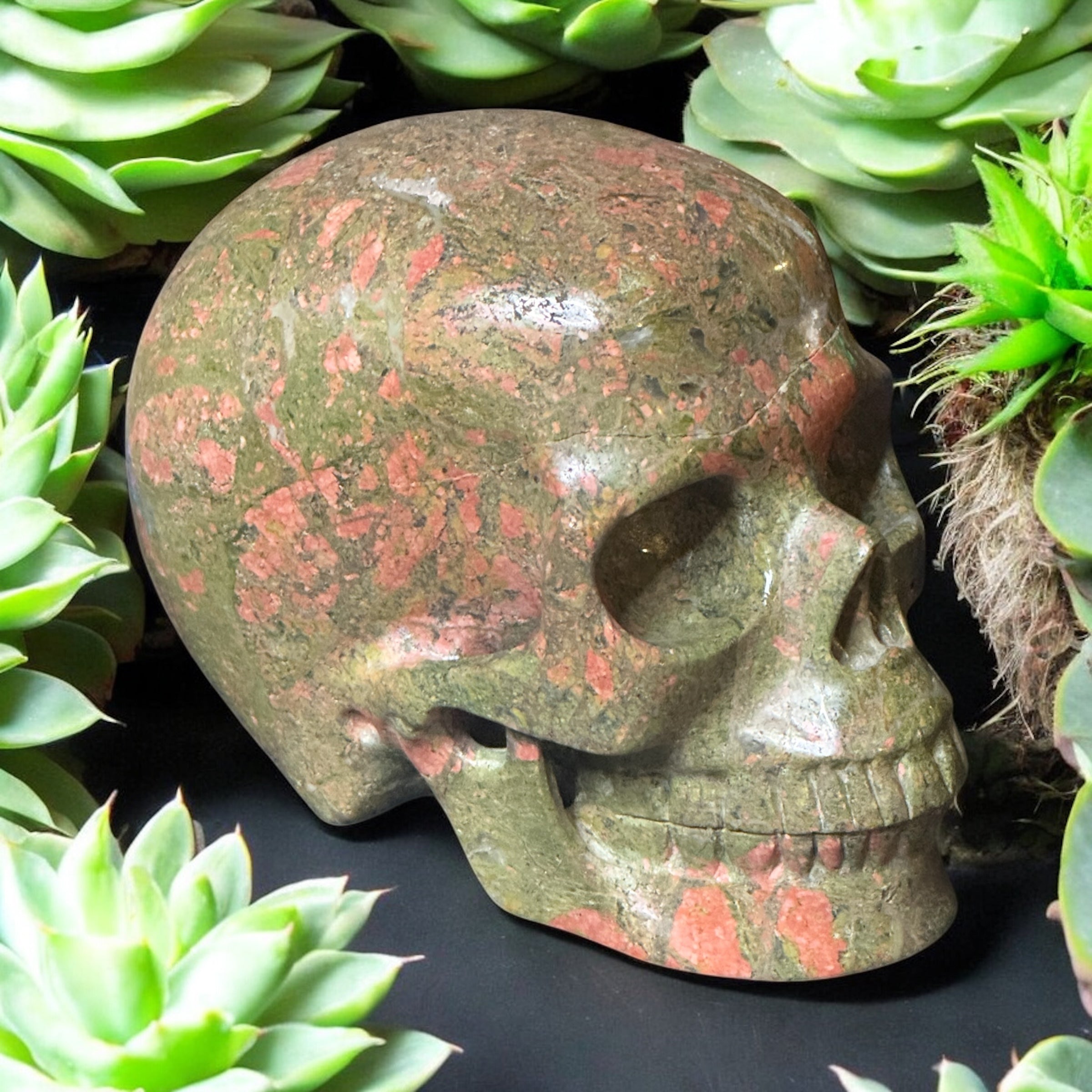 This hand-carved crystal skull is more than just a display piece—it's a symbol of inner evolution, ancestral connection, and emotional rebirth. Whether you're healing from past wounds, seeking harmony in relationships, or working with heart-centered intention, this Unakite skull offers unwavering support.