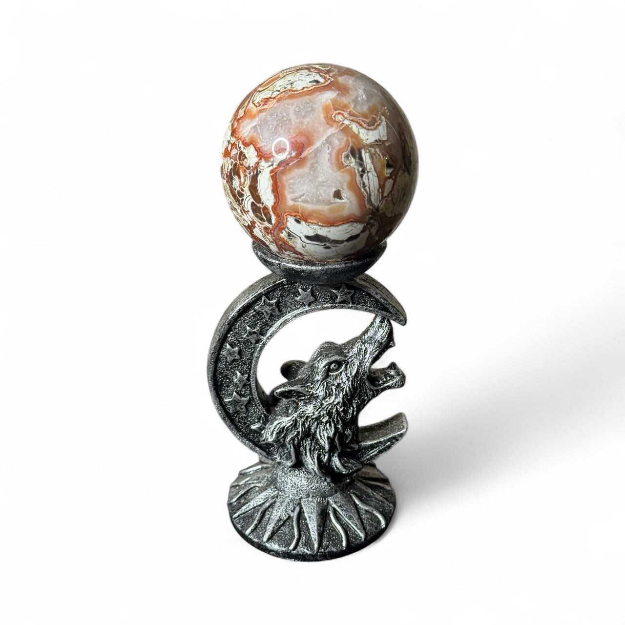 Honor instinct, intuition, and lunar magic with the Wolf & Moon Sphere Holder, a beautifully sculpted display piece designed to cradle and elevate your favorite crystal sphere. Featuring a wolf beneath the moon, this holder captures powerful symbolism associated with intuition, protection, freedom, and spiritual guidance.